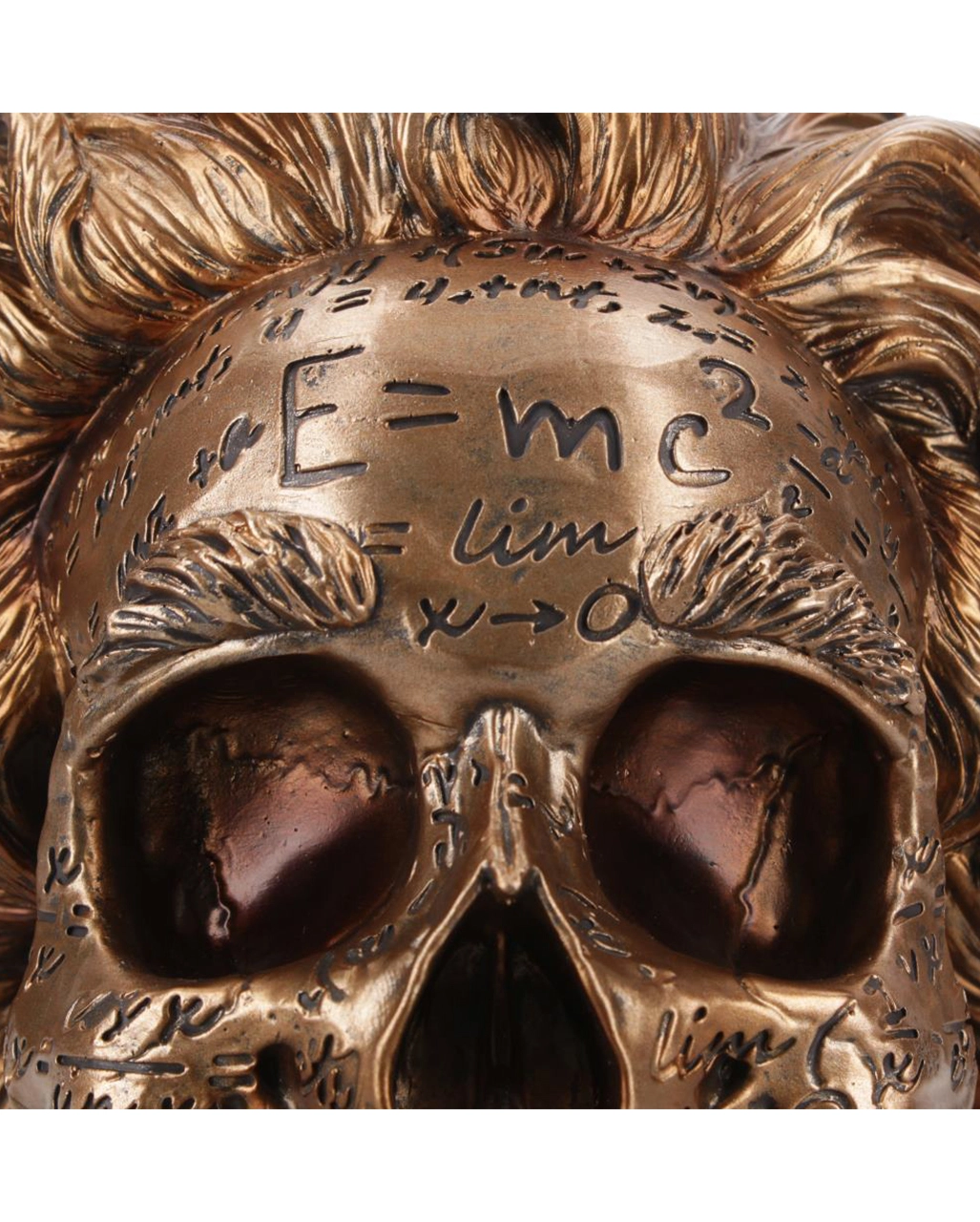 Der ungezähmten Fantasie eines chaotischen Künstlers entspringt dieser Schädel mit der Relativitätstheorie. Inspiriert von der Ikone der theoretischen Physik, Albert Einstein, ist dieser bronzefarbene Schädel mit mathematischen Gleichungen bedeckt und hat einen dicken Kopf mit wild aussehendem Haar.