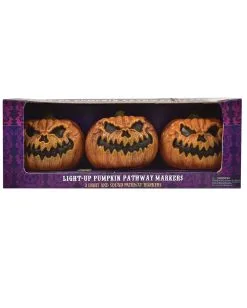 Die bösen Kürbis Gehweg Lichter mit Licht und Sound werden mit 3 AA-Batterien betrieben und durch Berüührung und Geräusche aktiviert. Die Lichter der Halloween-Deko entsprechen in Form, Aussehen und Farbe den typischen Jack-O-Lantern-Fratzen mit bösen dunklen Augenhöhlen und gezackten Zahnreihen auf schwarzem Grund. Einmal in Betrieb, beginnen die Kürbisse der Halloween-Dekoration zu leuchten und zu tönen. Noch mehr Animatronics wie den Greifender Raper Animatronic und die Schwarze Spinne mit Fernbedienung haben wir ebenfalls im Karneval-Universe.de!